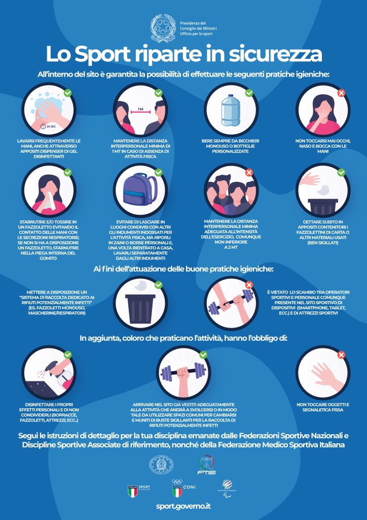 - Pratica senza mascherina, ma tienila a portata di mano per indossarla quando necessario (negli spazi chiusi o nei momenti in cui non si possono mantenere le distanze).